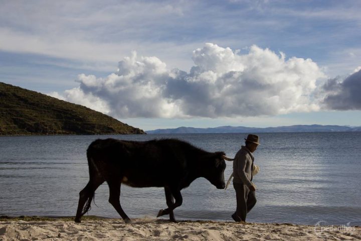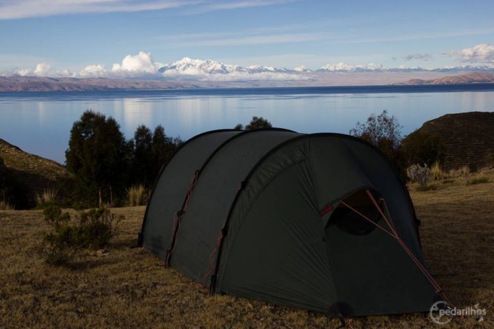 Dormimos duas noites na ilha, uma na praia norte, outra no topo de uma das montanhas com vista do lago de todos os lados, e também um extra, vista da Cordilheira Real majestosa. Ao acordar pela segunda manhã, um senhor que colhia galhos de madeira para seu fogo, decidiu que estávamos acampando em um lugar sagrado, especificamente aquele morro era um lugar sagrado, e por isso deveríamos pagar $5 bolivianos cada um e estaríamos perdoados de tamanho sacrilégio. Insistimos que não sabíamos que o lugar era sagrado, já que não havia nenhum cartaz ou altar nas proximidades, apenas grama! E que não tínhamos mais dinheiro de qualquer maneira, porque já havíamos gasto tudo nos pedágios. Então gentilmente despachamos o senhor dizendo que esperávamos que Pachamama nos perdoasse, que já estávamos de saída mesmo… Mas mesmo cometendo um pecado de acampar por ali, Pachamama havia nos presenteado um magnífico entardecer, uma noite estrelada maravilhosa, e uma macia grama para descansar nosso corpinho. Acho que afinal, Pachamama não estava tão brava com a gente, nos dando tantos presentes…
