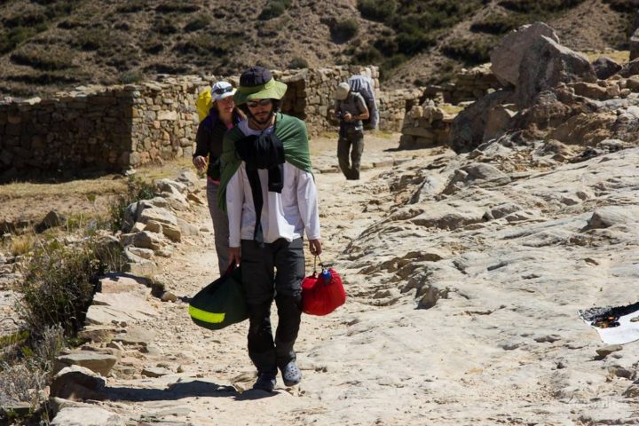 Arrumamos toda tralha numas mochilas improvisadas, as bicicletas teriam que ficar, não há onde pedalar na Ilha do Sol. Como despachamos nossas mochilas em Salta, e não encontramos nenhuma para alugar, decidimos ir como desse. O André usou o toldo dobrado como uma mochila de cholita improvisada, e eu armei minha jaqueta impermeável, sendo os braços a alça da mochila, o restante tudo na mão ou meio pendurado de qualquer jeito.