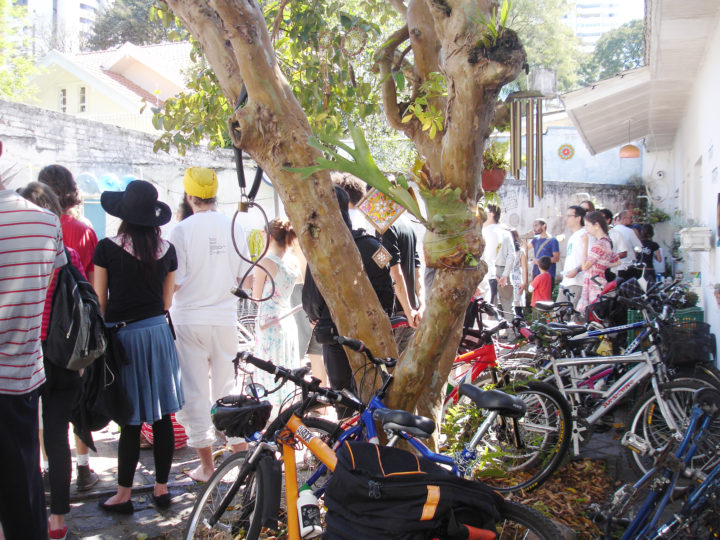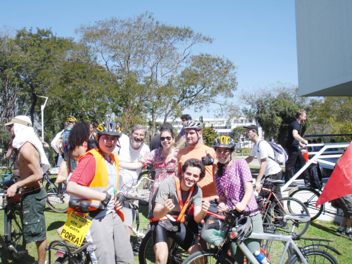 Alguns minutos na concentração ao som de Plá, e chega o reforço. Tratava-se de parte da Bicicletada São Paulo que chegava aos gritos de “Vai Coríntia”, buzinando e fazendo aquela festa bonita. Começa a mandala no pátio da Reitoria, e em seguida a retomada das ruas.